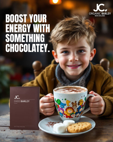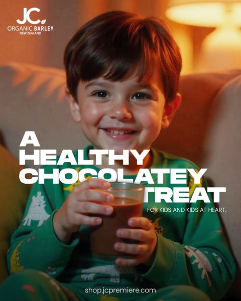 Savor the rich, chocolatey goodness of JC Choco Barley, a perfect blend of premium cocoa and organic barley grass from New Zealand—made for kids and the whole family.